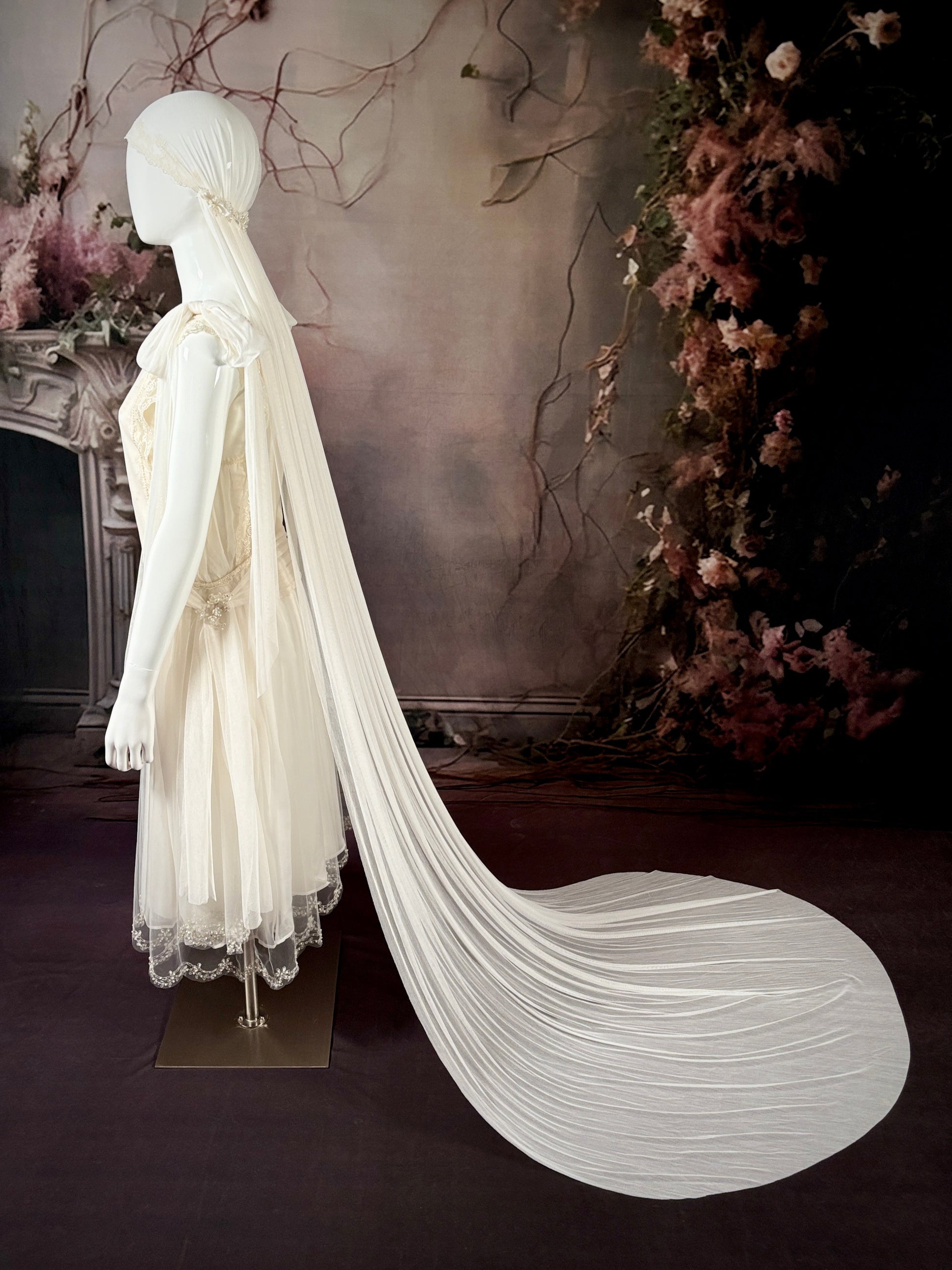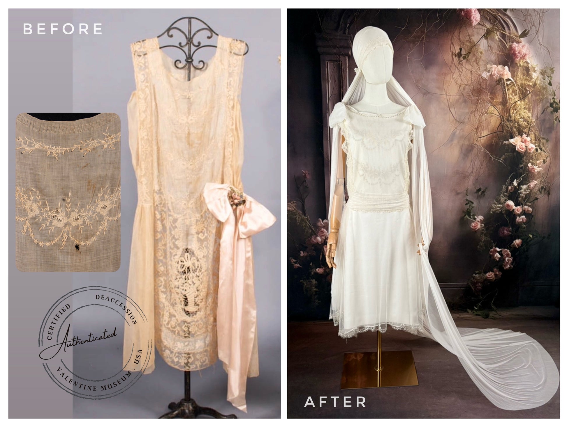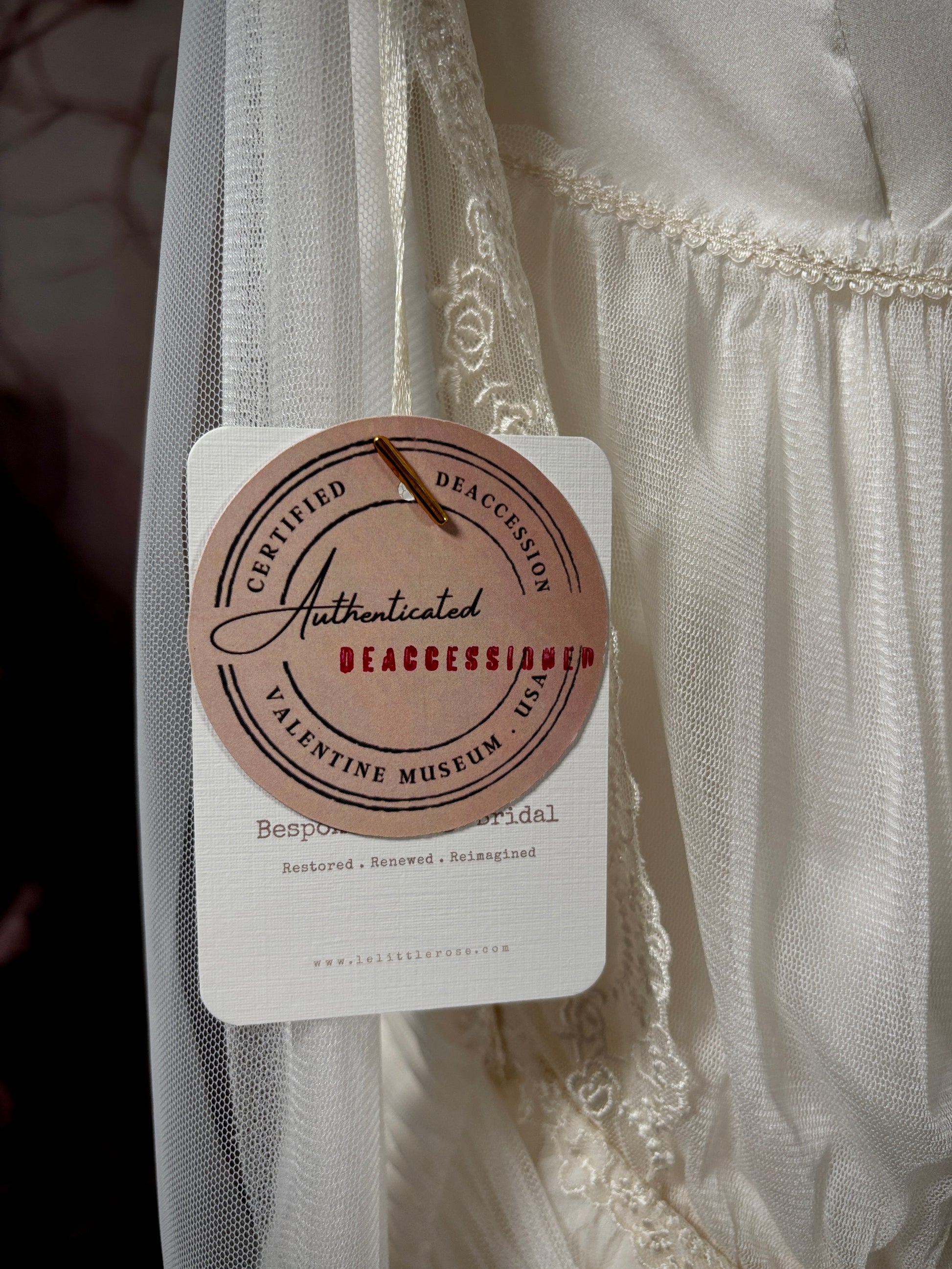 Extras: We provide fully restored vintage veils, brand new hand-sewn premium nylon veils, and luxurious silk veils. Custom petticoats and era-appropriate slips are also available upon request. Reach out today to transform your dream wedding gown into reality!