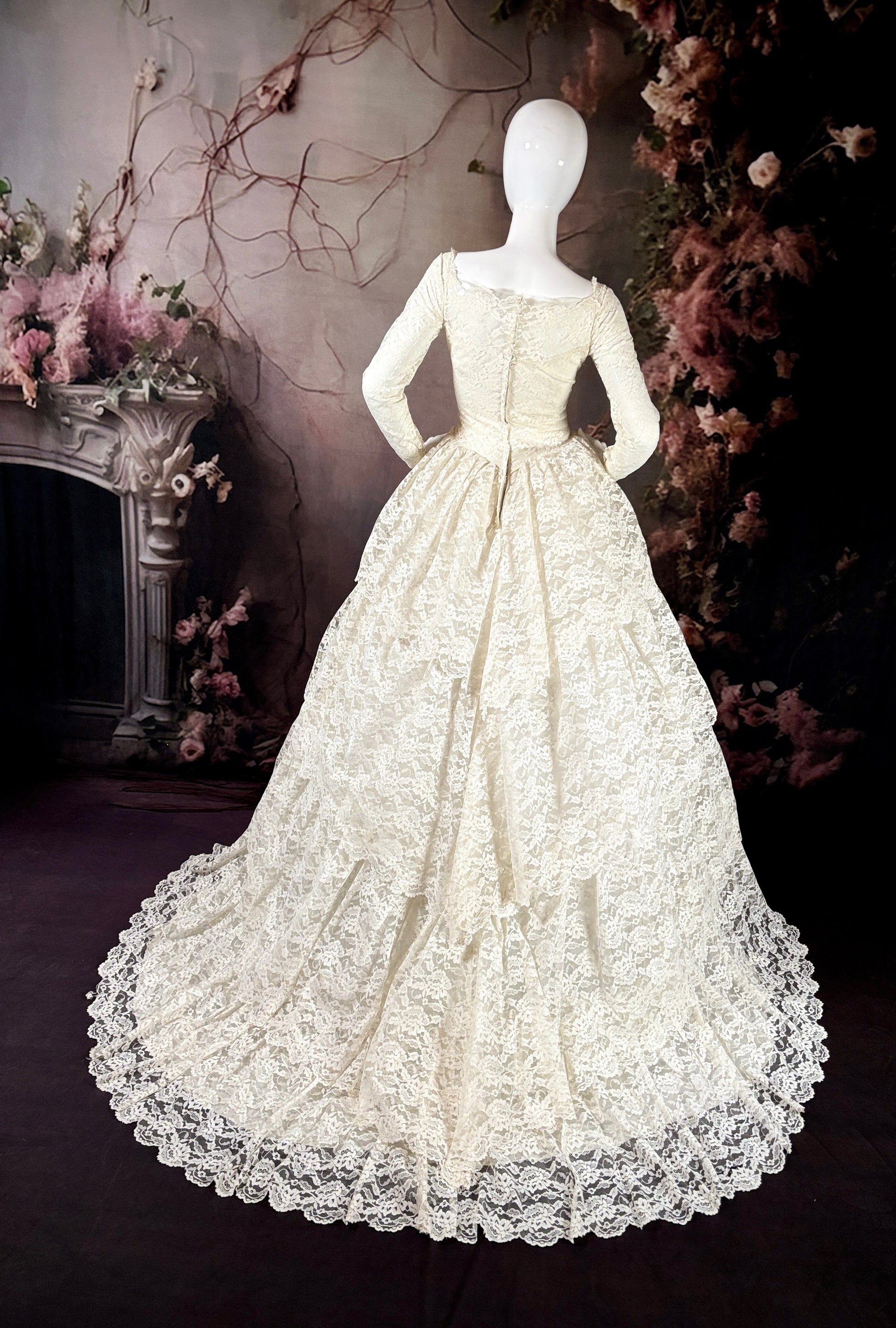 1950s Lace Cupcake Tiered Wedding Dress & Trailing Train