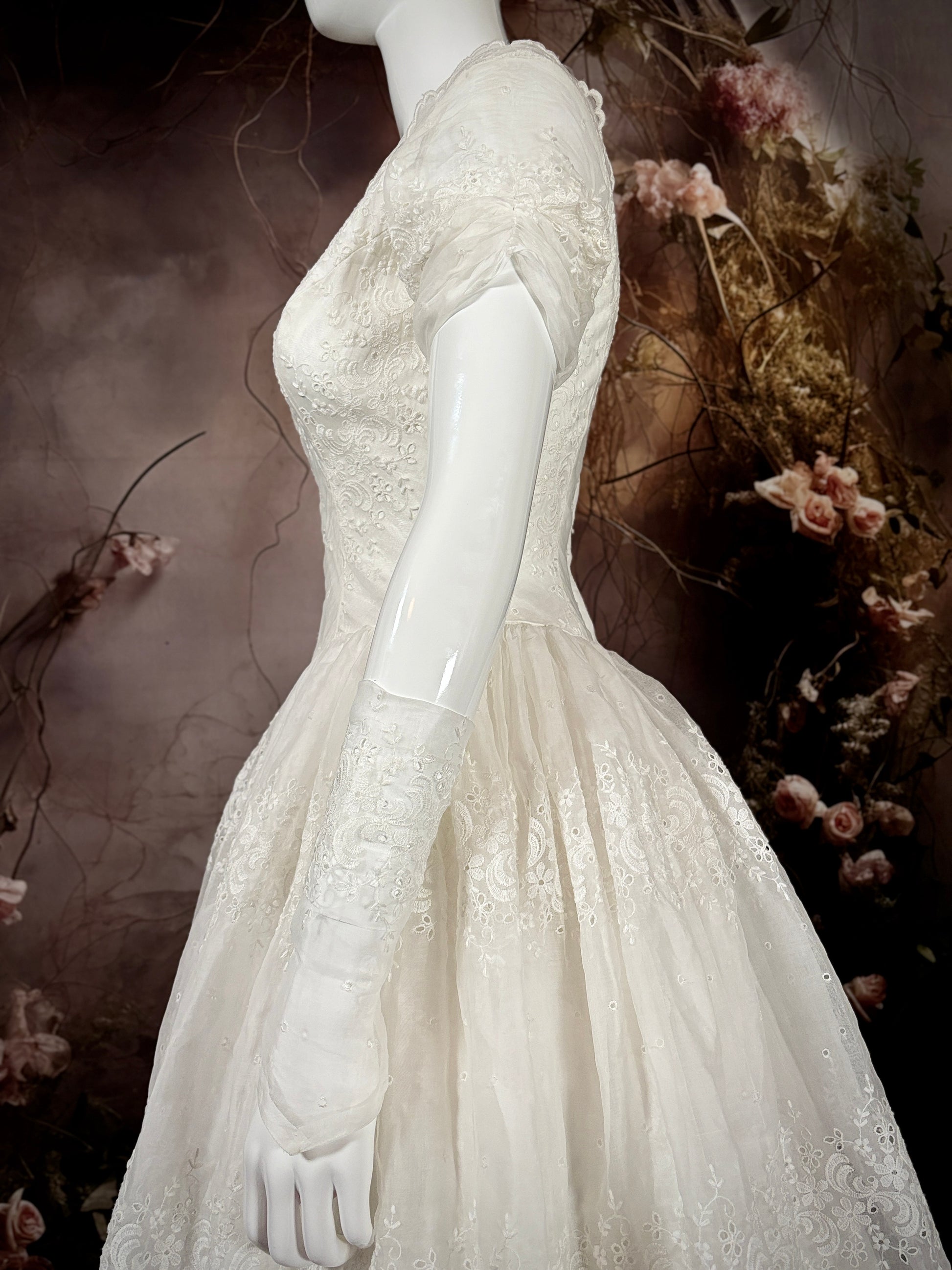 1950s Embroidered Rayon Organza Tea Length Wedding Dress W/Arm Sleeves