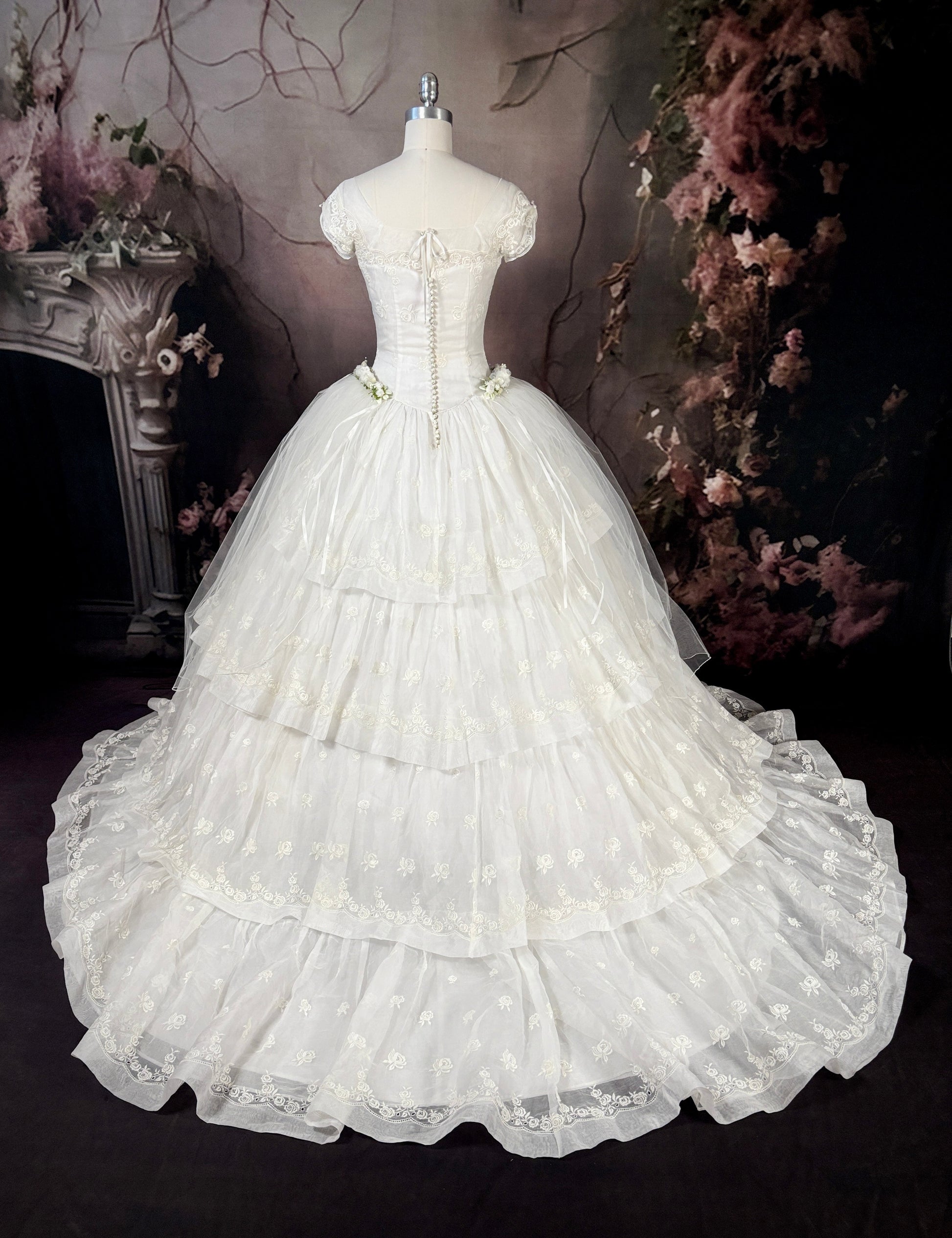 1950s Reimagined Cupcake Tiered Rose Wedding Dress & Trailing Train