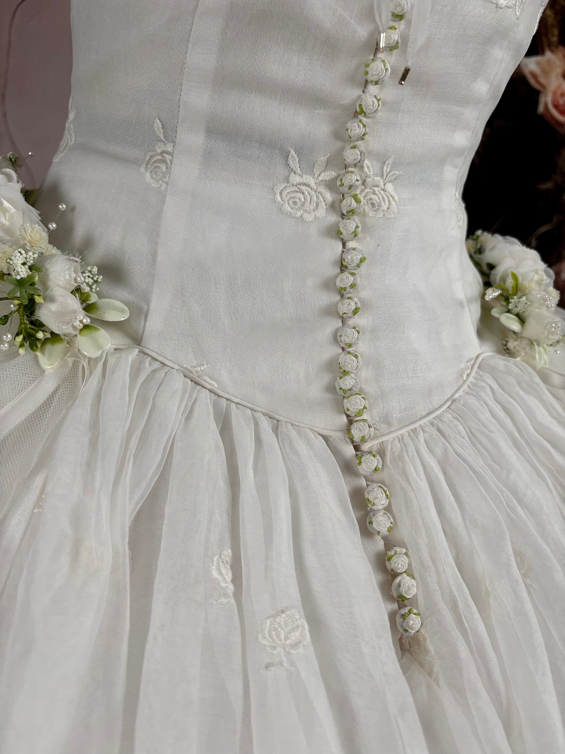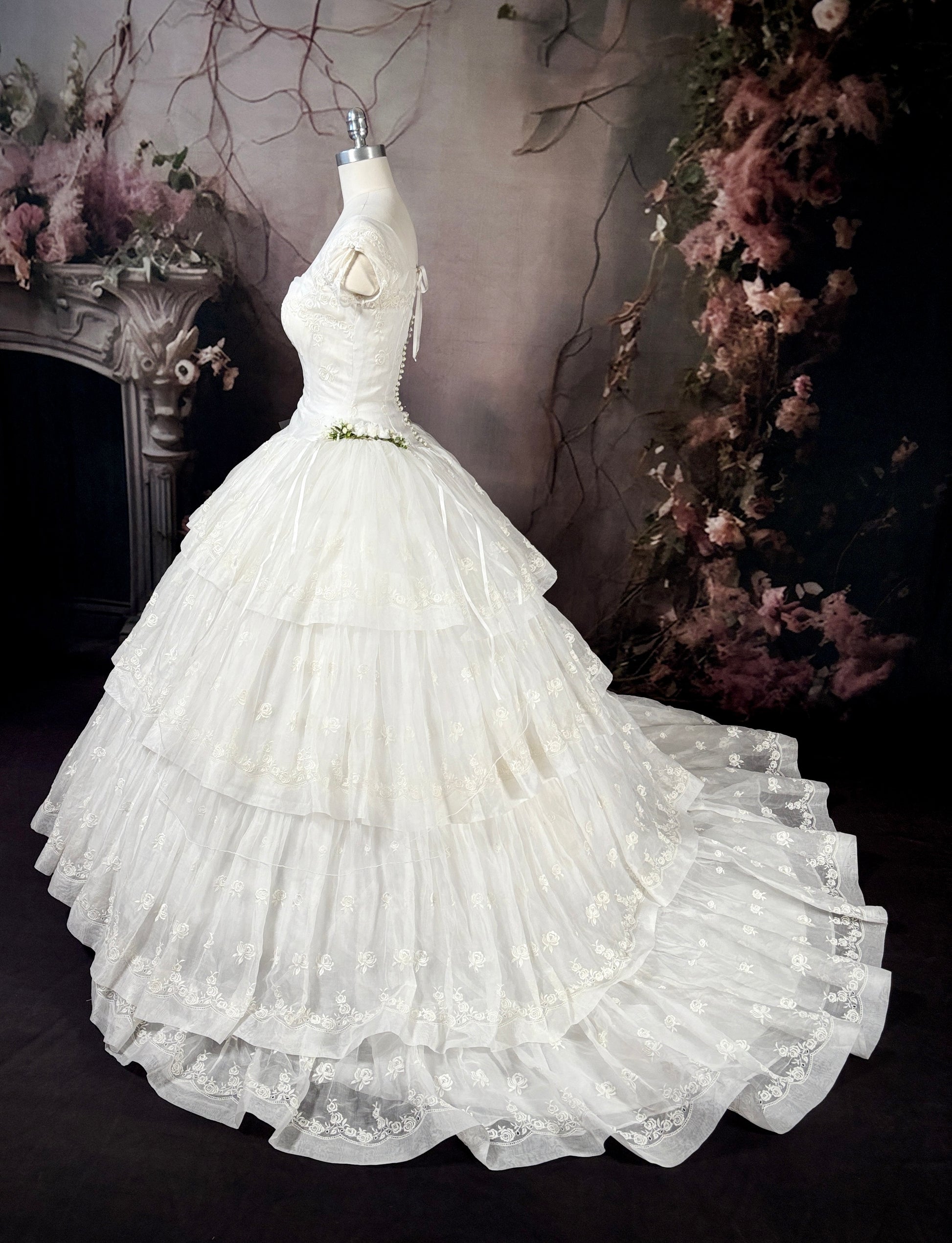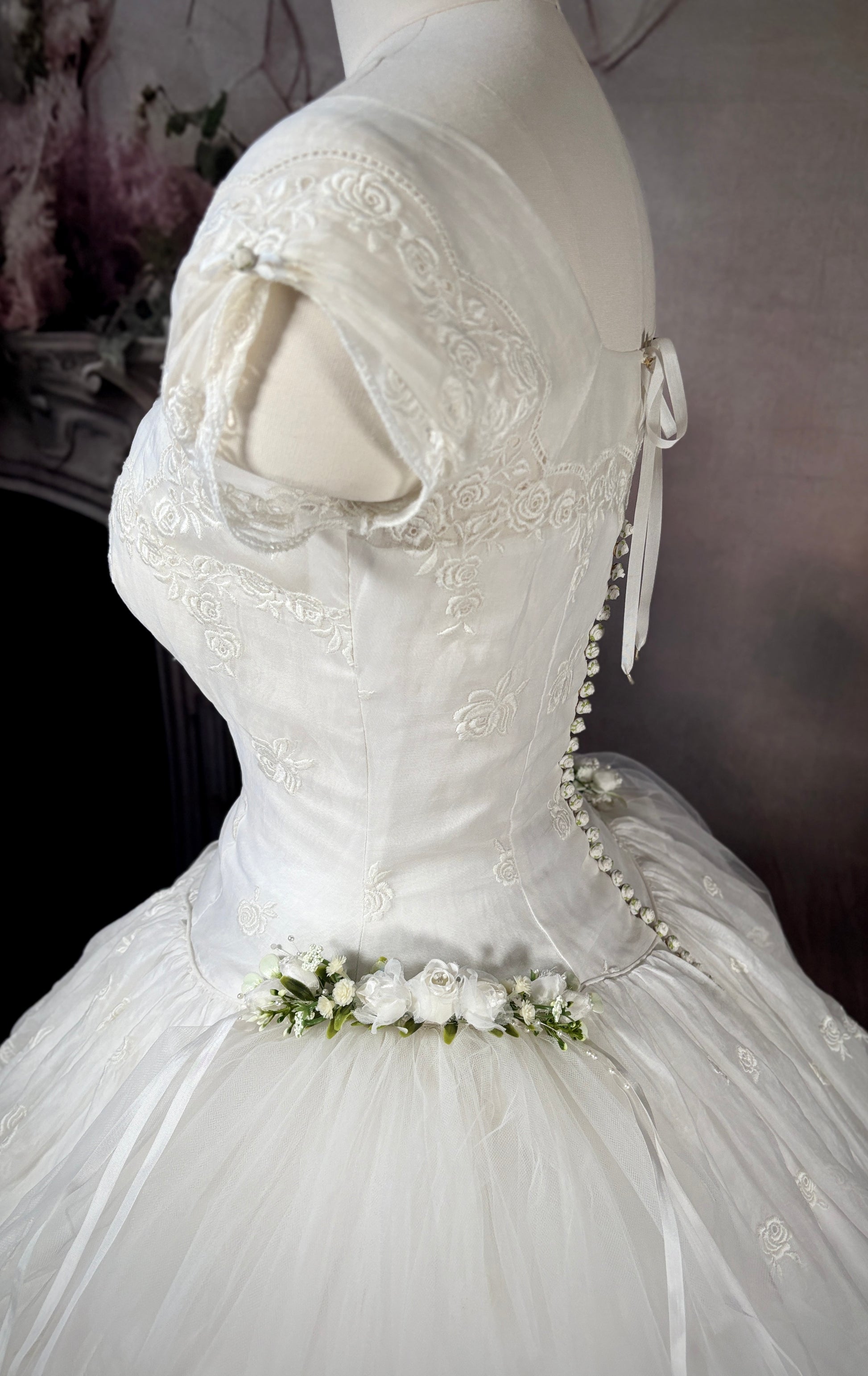 This 1950s Wedding Dress has been beautifully Restored and Reimagined; evoking the charm of a bygone era. Delicately embroidered in a lovely rose motif, the design graces the fitted bodice, gathered cap sleeves, and elegantly trims out each layer of the tiered skirt. It has a trailing line of beautiful silk ribbon-embroidered buttons, handcrafted by award winning artist Irina Usakova and affixed to 18k gold button backs. The cap sleeves, bodice and back silk ribbon closure also feature the same buttons in a mini size. At the drop waist are a set of detachable floral & tulle rose garlands, adorned in silk ribbon that cascades down to a romantic trailing train. This renewed and reimagined wedding dress is featured with a petticoat ensemble inspired by the southern belles of the 1860s. Making this gown truly, one of kind!