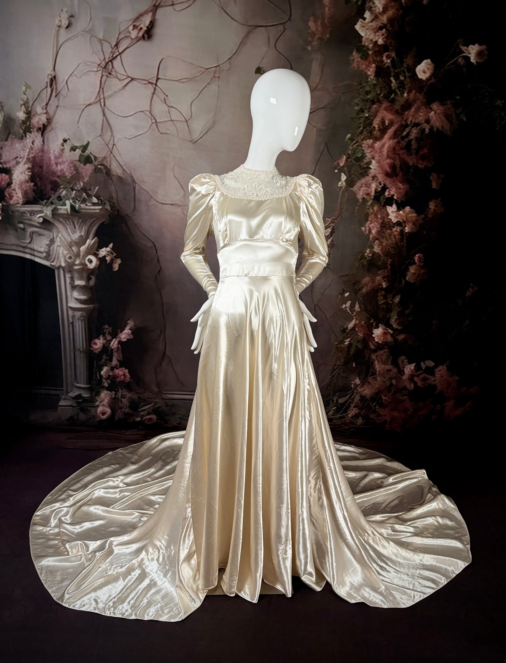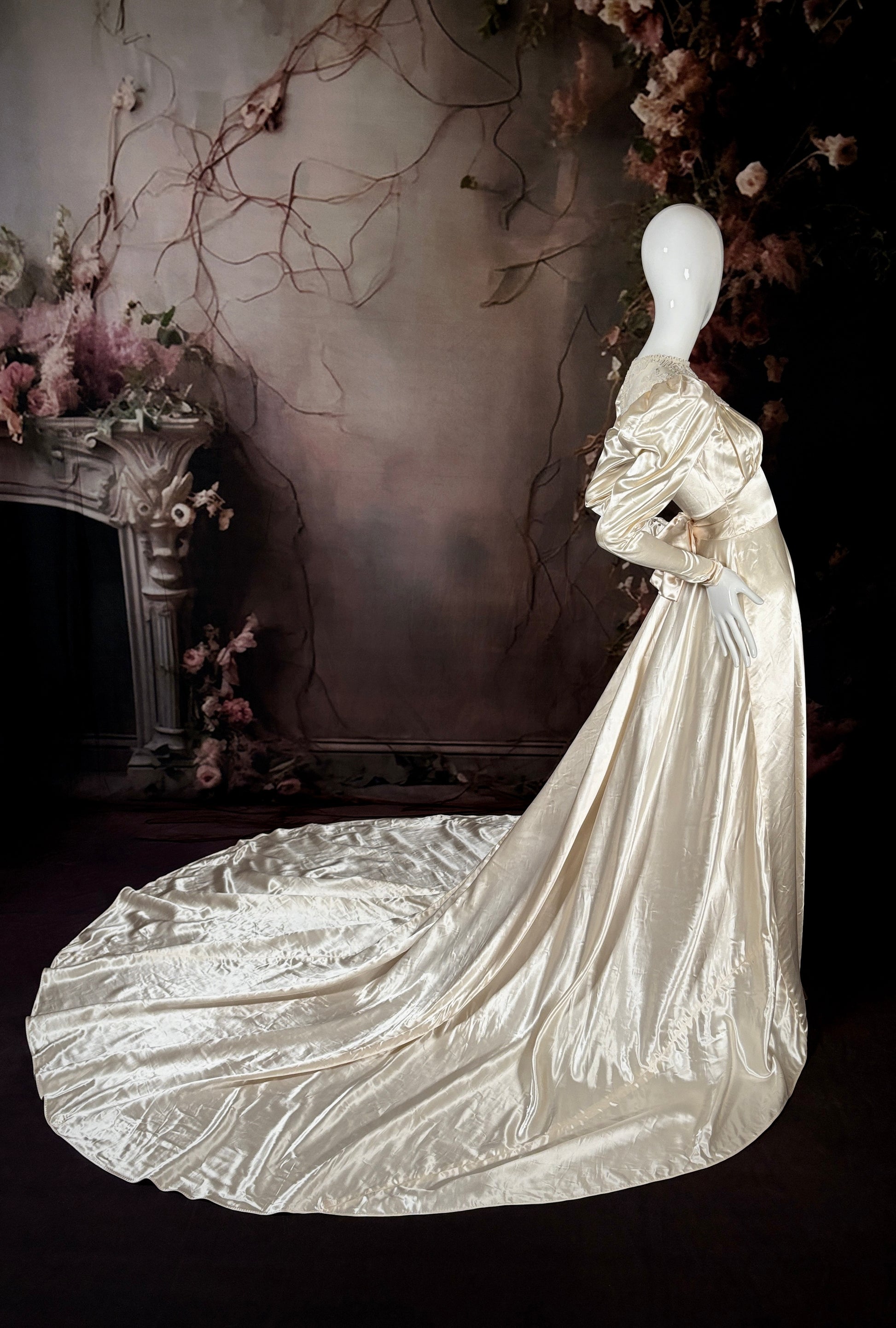 Extras: We provide fully restored vintage veils, brand new hand-sewn premium nylon veils, and luxurious silk veils. Custom petticoats and era-appropriate slips are also available upon request. Reach out today to transform your dream wedding gown into reality!