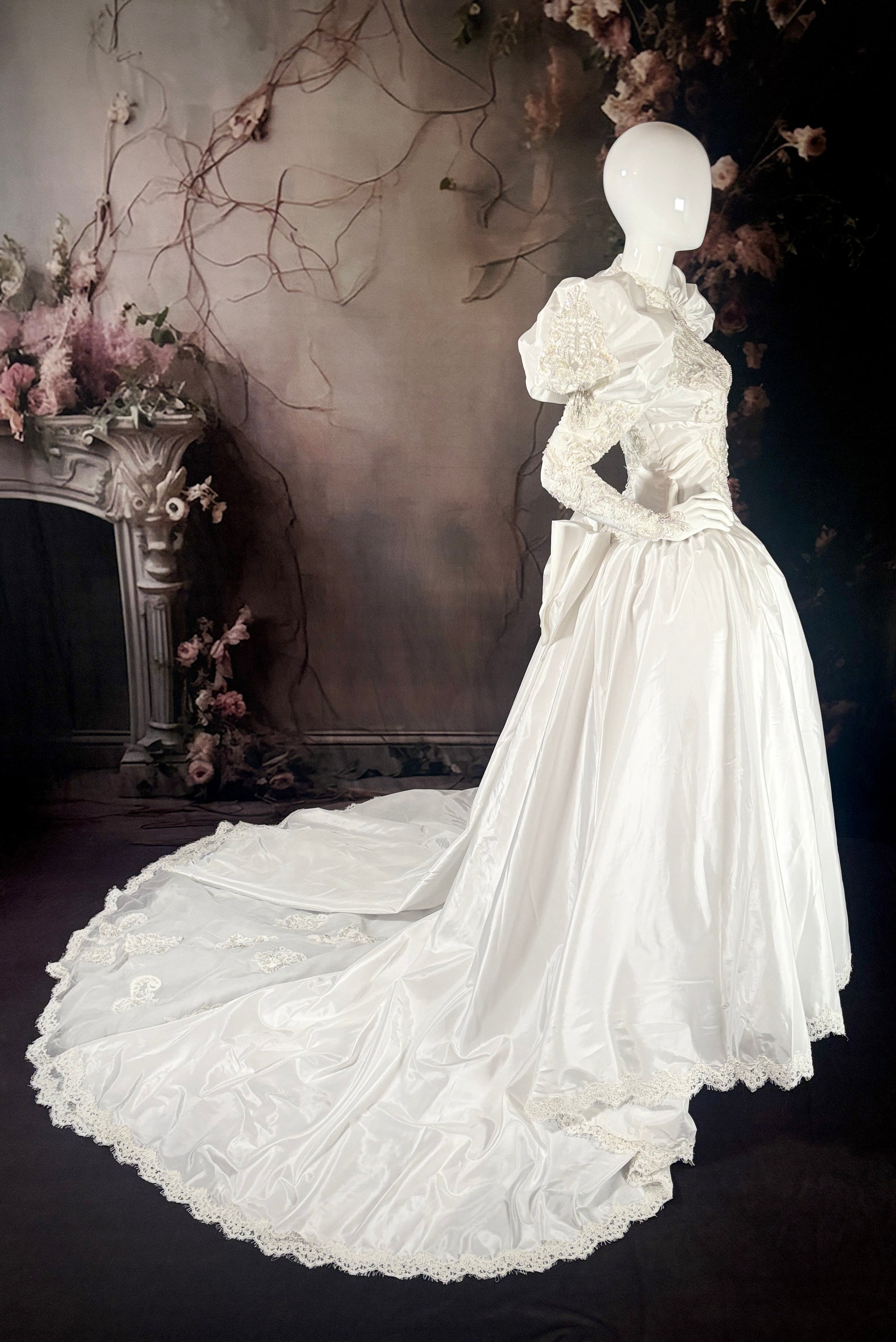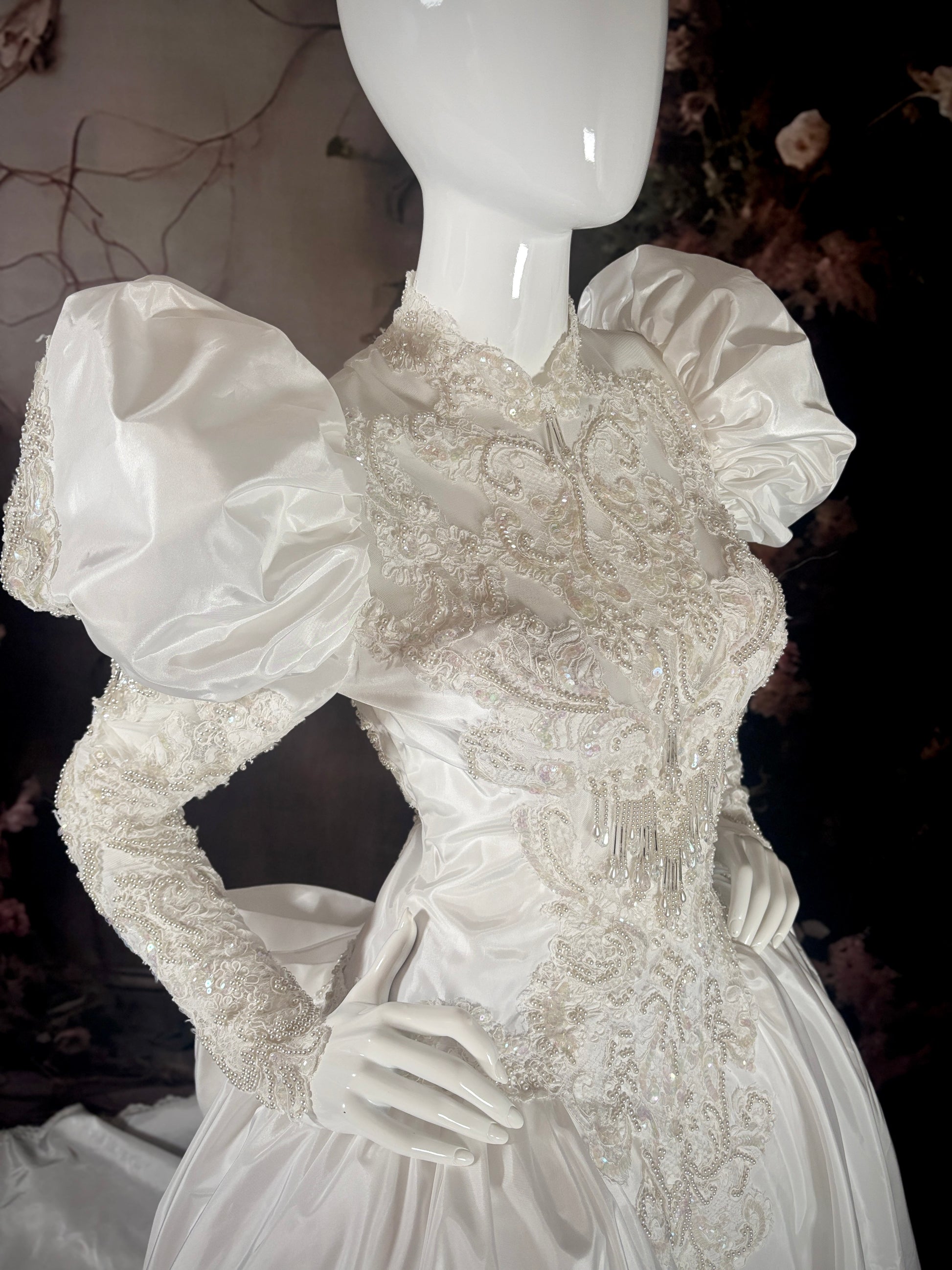 1980's Duchess Satin Wedding Dress, w/Juliet Puff Sleeves & Trailing Train