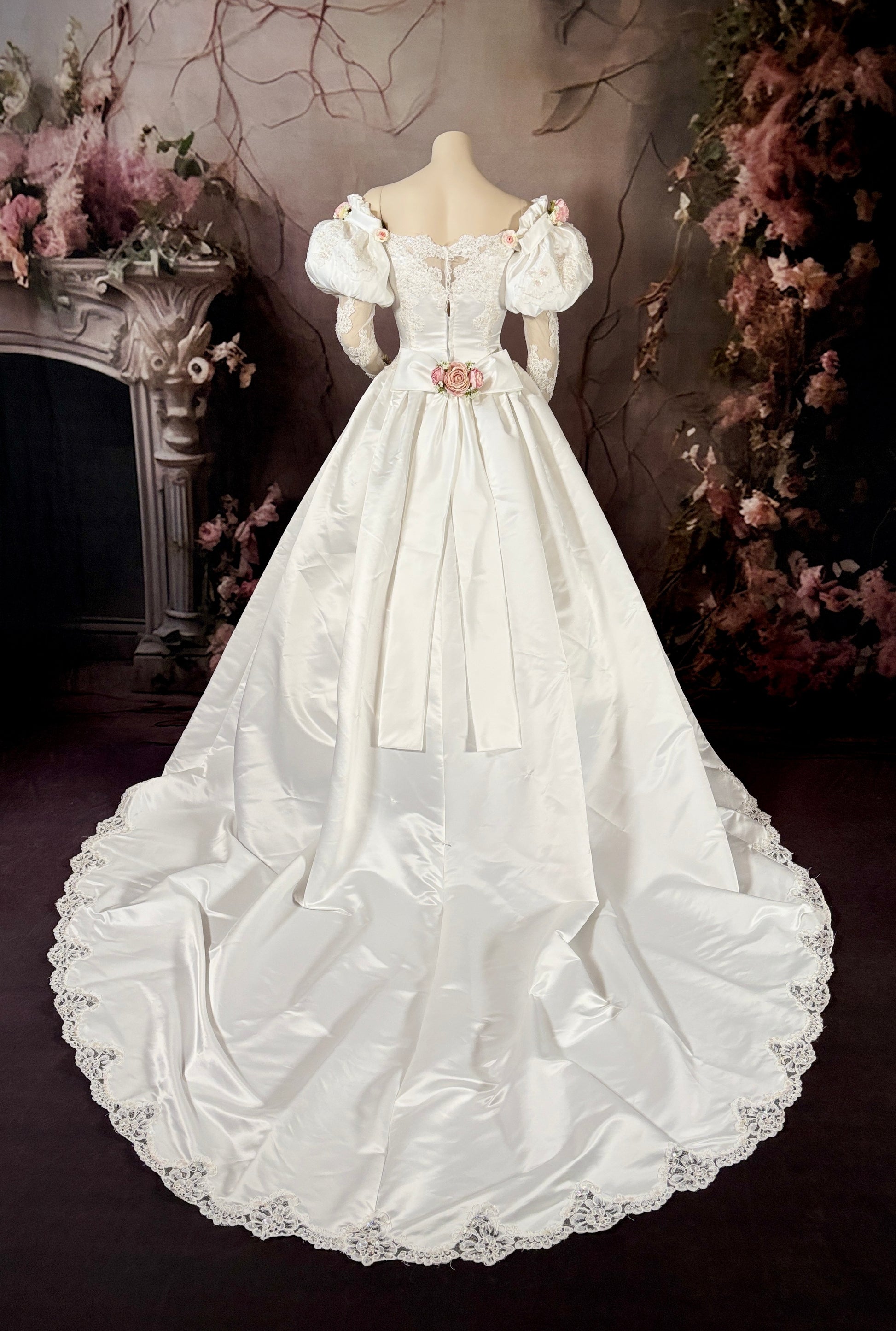 1980's Rose Princess Satin & Lace Wedding Dress w/Juliet Puff Sleeves & Chapel Train