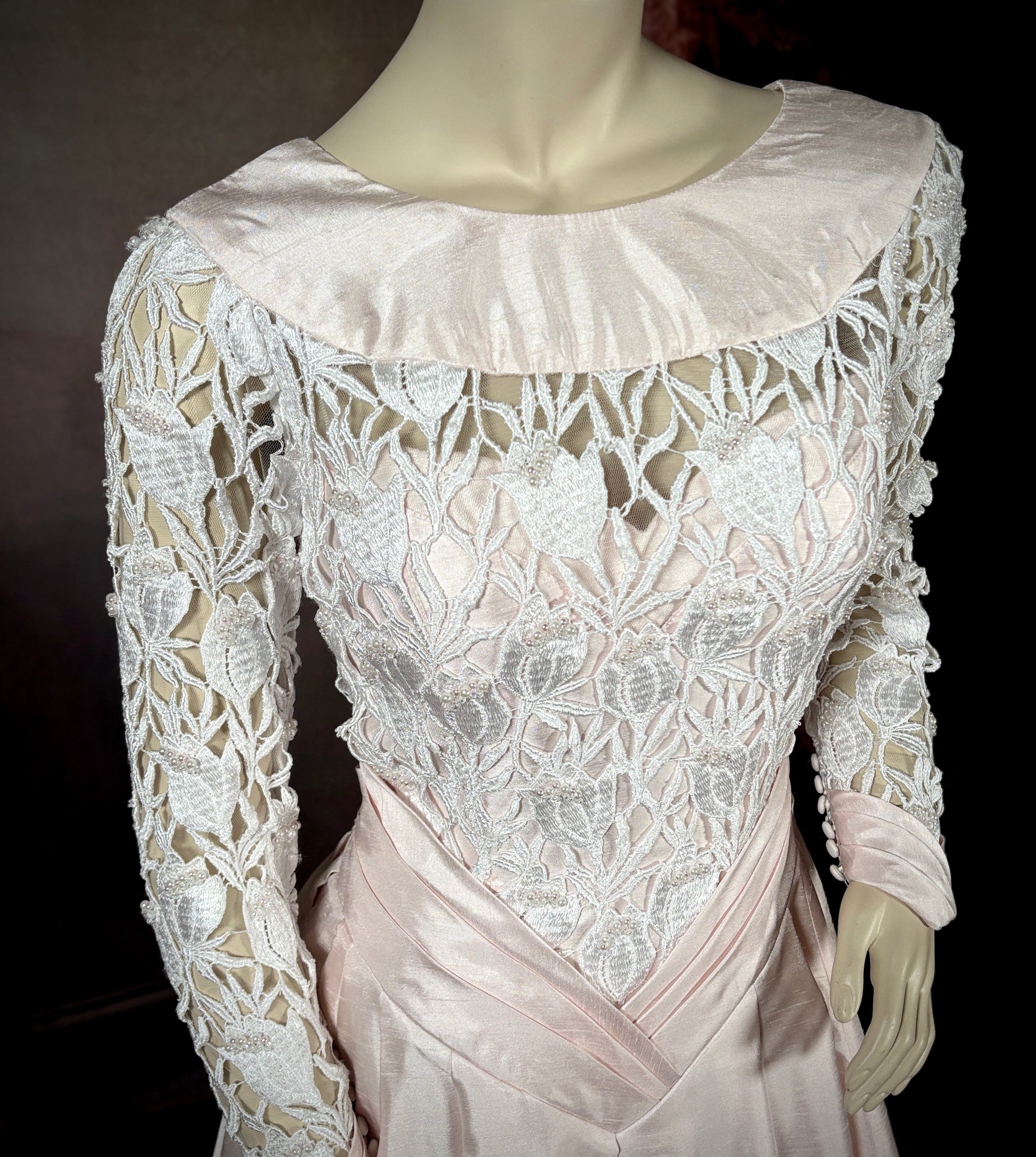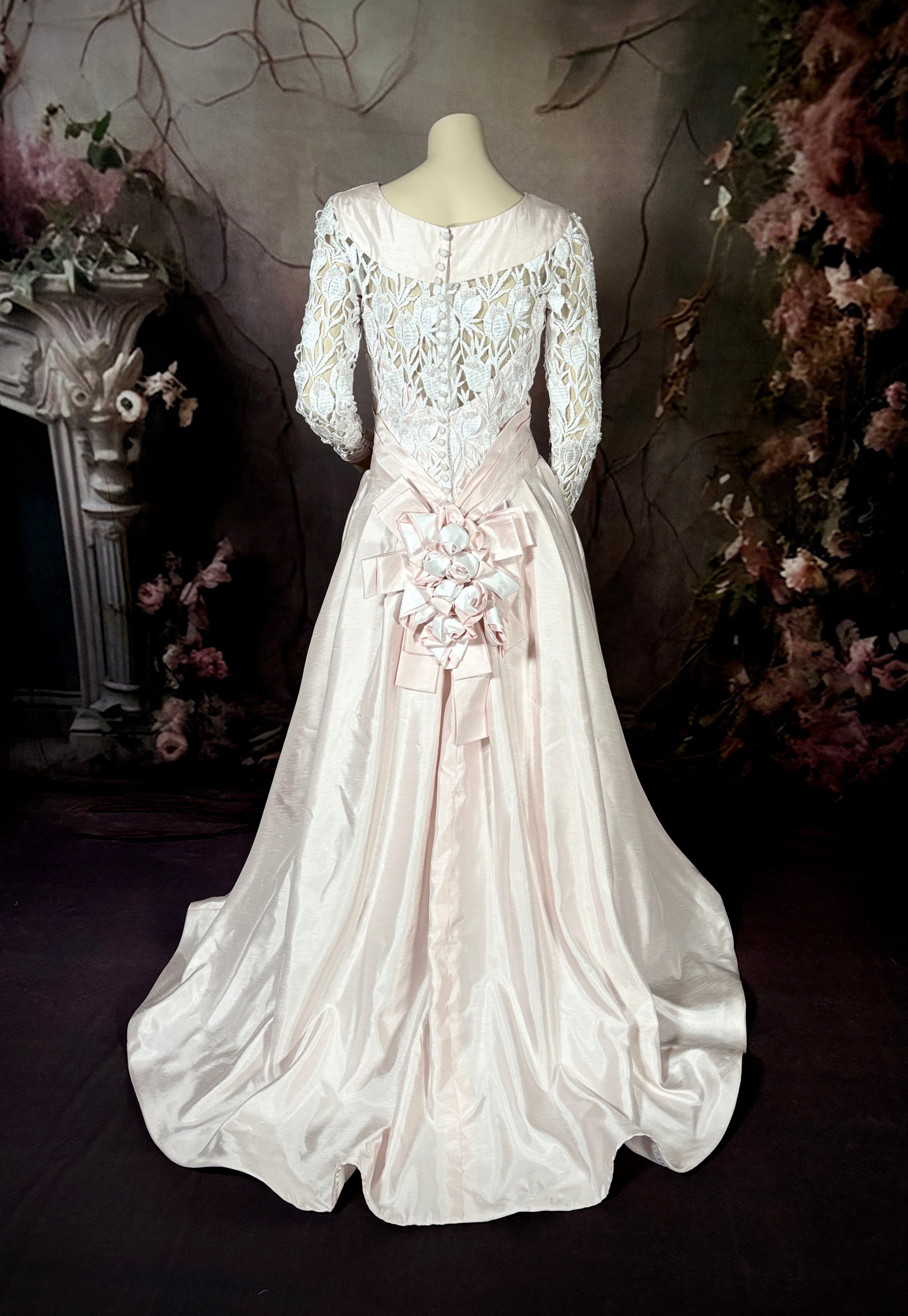 1998 Shantung & Beaded Venice Lace Wedding Dress in Blush Pink w/Sweeping Train