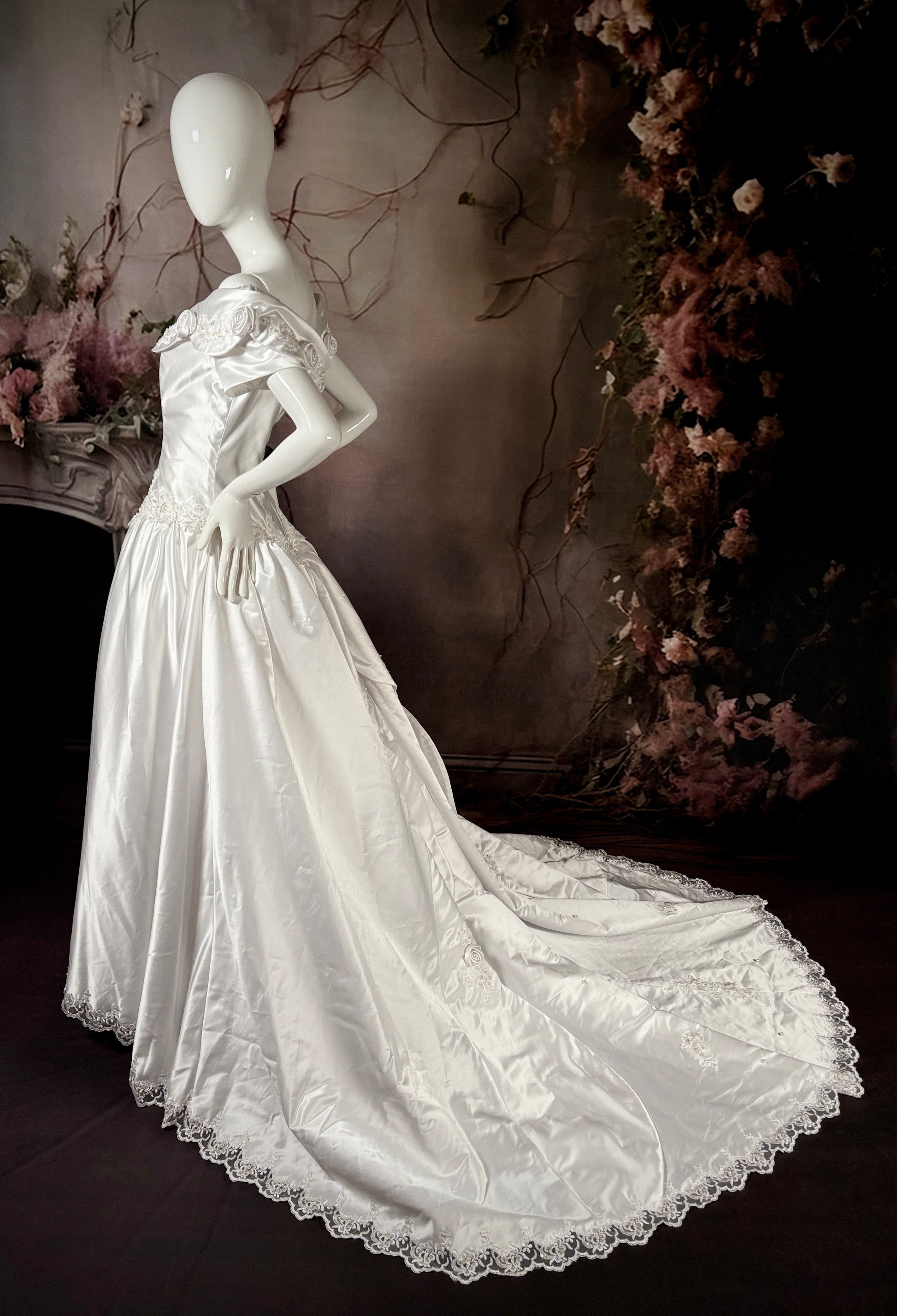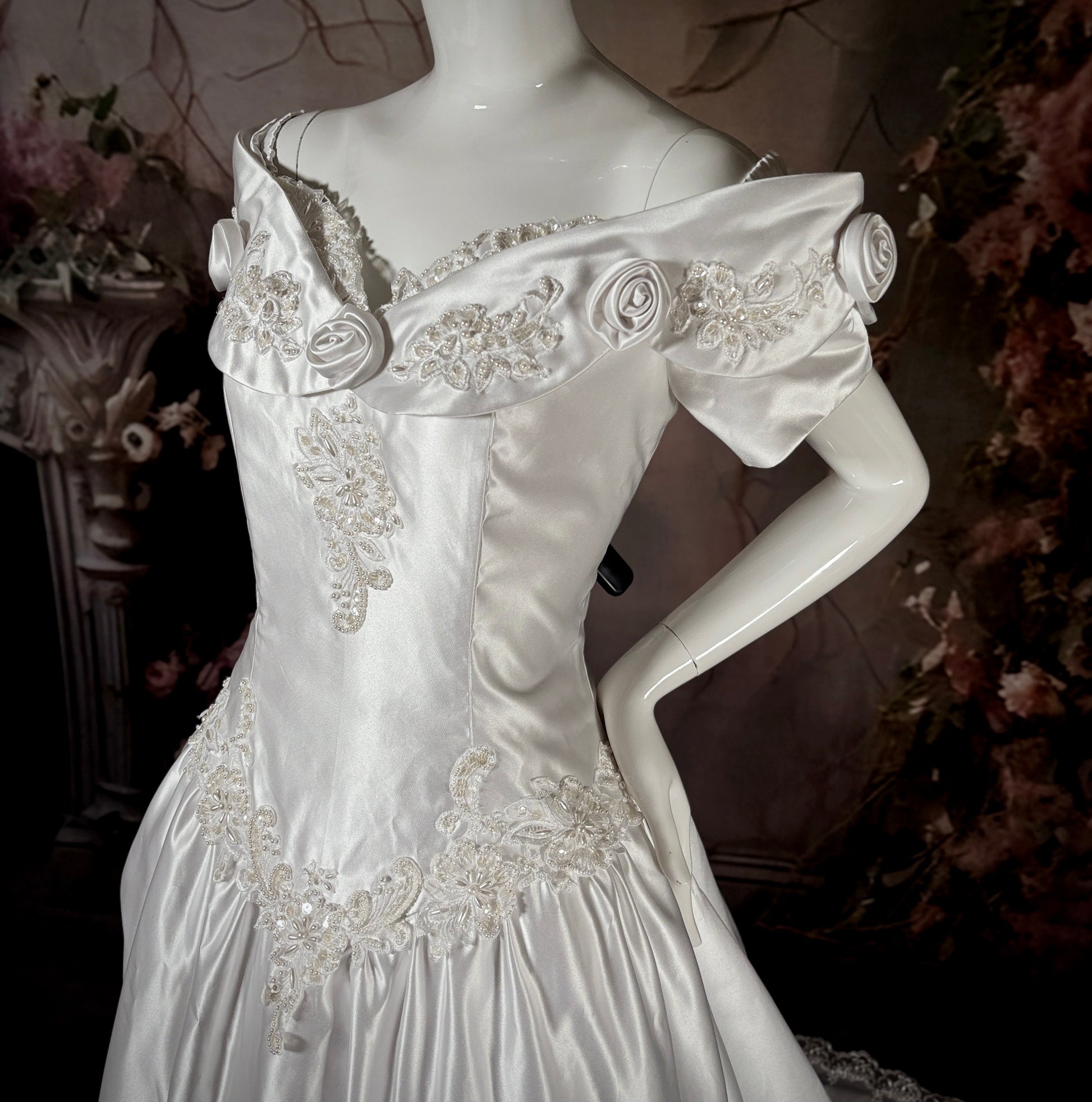 This stunning 1990s wedding dress is crafted from duchess satin and is fully lined. The romantic off-the-shoulder bodice features short sleeves and a sweetheart neckline, intricate lace appliques, delicate beading, and charming satin rosettes. This princess silhouette flows into a full, gathered skirt and boasts a dramatic scalloped chapel train further adorned in satin rosettes. It is finished with a discreet zipper offering customizable options. Select from a corset insert, vintage buttons, newly crafted silk buttons, or an array of available options to compliment the back of this beautiful 1990s wedding gown.